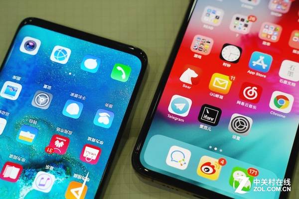 外觀上來說,華為Mate 20 Pro與iPhone XS都采用了劉海屏的設計,不過從兩款手機的直接觀感上來看,iPhone XS的邊框寬度似乎更加均勻一些。當然,在整體邊框也更加寬一些,這點發布會的PPT上已經體現過了。