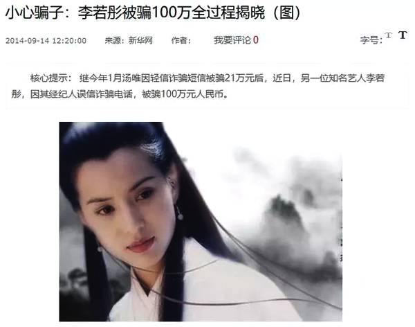 單在2014年,湯唯和“小龍女”李若彤就先后被電信詐騙了21萬和100萬。